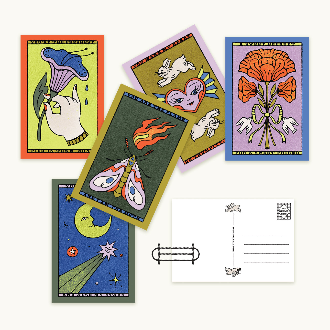 Send it in the mail or hand it off! These postcards include brand new illustrations for you and your loved ones.